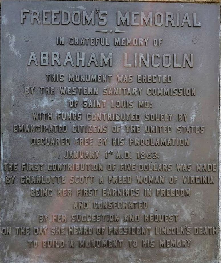 Freedom’s Memorial, also known as the Emancipation Monument in Lincoln Park in Washington, D.C. has a plaque that reads “in grateful memory of Abraham Lincoln this monument was erected by the Western Sanitary Commission. of Saint Louis Mo: with funds contributed solely by emancipated citizens of the United States declared free by his proclamation January 1st A.D. 1863. The first contributionof five dollars was made by Charlotte Scott, a freed woman of Virginia being her first earnings in freedom and consecrated by her suggestion and request on the day she heard of President Lincoln’s death to build a monument to his memory.