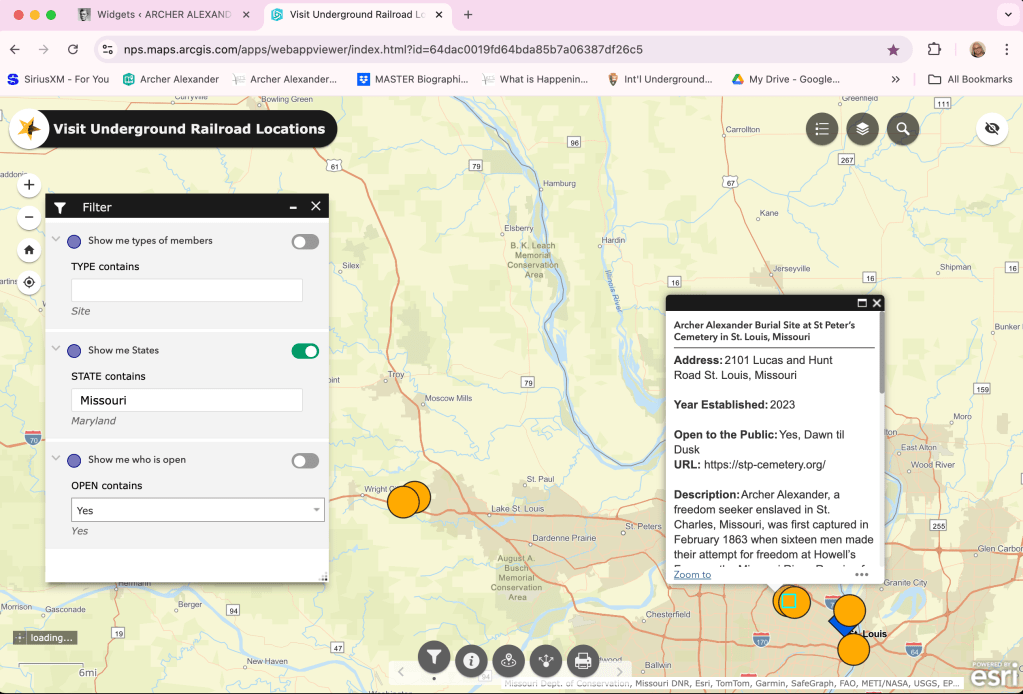 More than four years passed, when in April of 2023, Bill Baumgartner and Dorris Keeven-Franke, were discussing Archer Alexander with the Midwest Regional Director Barry Jurgensen, of the National Park Services, National Underground Railroad Network to Freedom, and they agreed that a Memorial at St. Peter’s U.C.C. Cemetery was needed. This was shared with Keith Winstead at that time. Then that September of 2023 Archer Alexander’s Burial site was listed on the NPS National Under Railroad Network to Freedom!