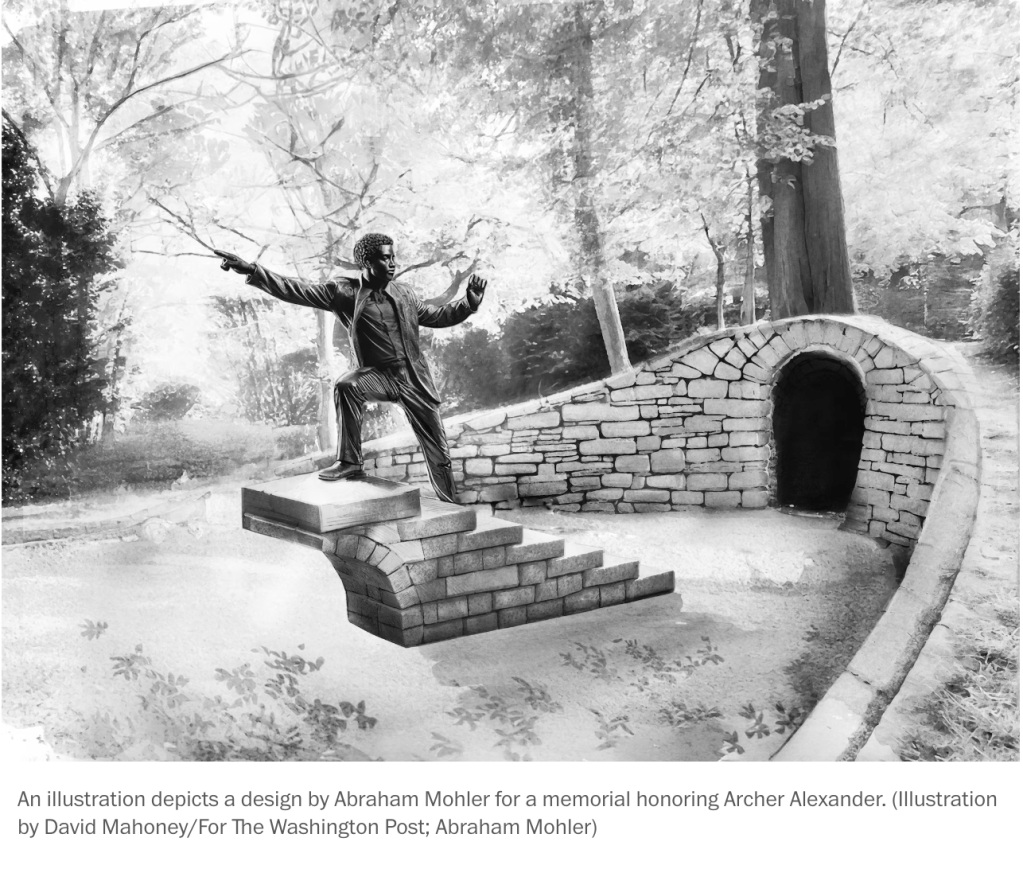 In his column, Kennicott introduces the new Archer Alexander Memorial in St. Louis (in Normandy at 2101 Lucas and Hunt) at the St. Peter’s United Church of Christ Cemetery that sculptor Abraham Mohler, has designed in partnership with the St. Louis Chamber of Arts and the friends and family of Archer Alexander. “Last year, on April 14, yet another memorial idea was introduced to honor Alexander individually at the graveyard near St. Louis where he is buried. The designer, Abraham Mohler, would depict Alexander as a vibrant young man, free and emerging triumphantly from the shadows of history.” The site of Archer Alexander’s unmarked burial is listed on the National Underground Railroad Network to Freedom.